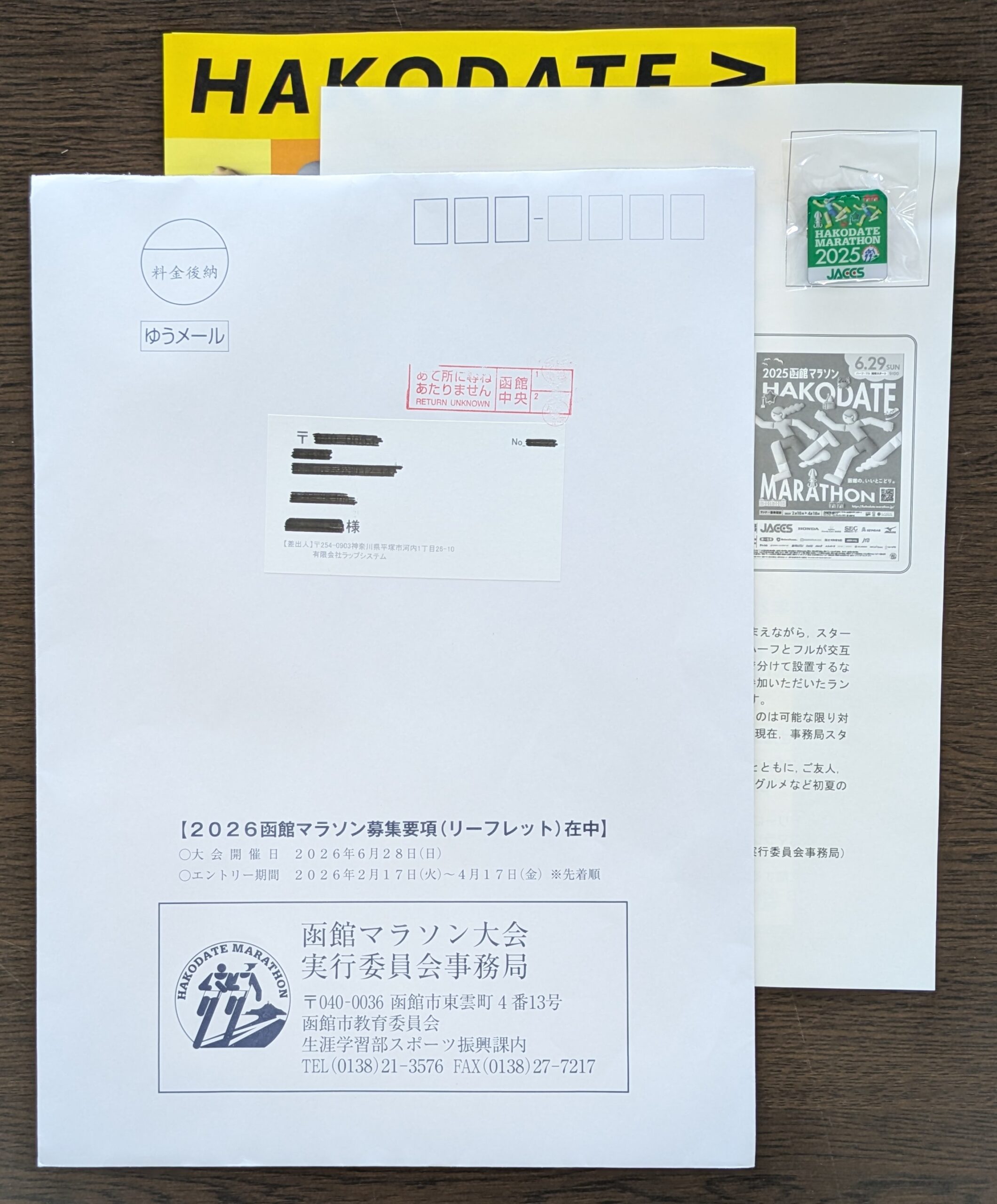 2025大会にエントリーされた皆様へ、2026大会の募集要項と一緒に「参加記念ピンバッジ」を発送いたしましたが、住所不明により大会事務局に戻ってきているものがあります。